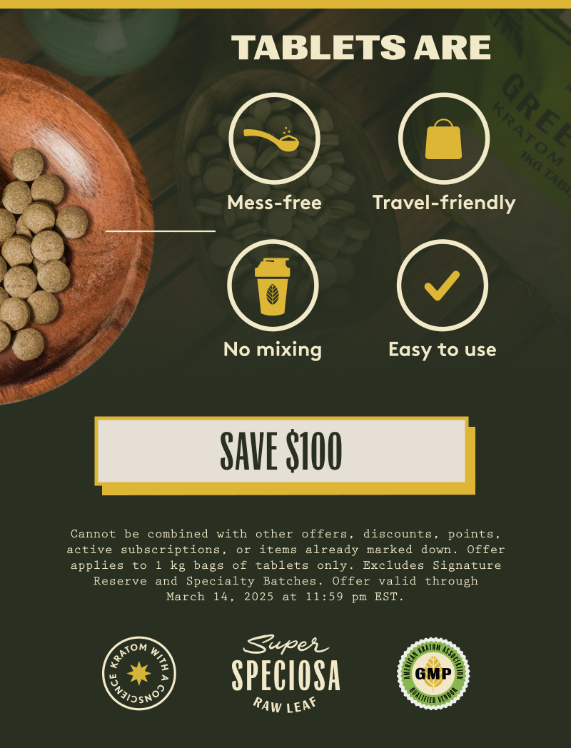 These statements and products presented in this email have not been evaluated by the Food and Drug Administration FDA. The products mentioned in this email are not intended to diagnose, prevent, treat, or cure any diseases or health conditions. Therefore any information in this email is presented solely as the opinions of their respective authors who in which do not claim in any way shape or form to be medical professionals providing medical advice. SuperSpeciosa.com and its owners or employees cannot be held responsible for, and will not be liable for the inaccuracy or application of any information whatsoever herein provided. By purchasing our products you agree that you are aware and in compliance with your local county, state, or federal regulations. Must be 21 years or older to purchase Kratom. The US FDA has not approved kratom as a dietary supplement. We do not ship to the following states, cities, and counties in the US where Kratom is banned: Alabama, Arkansas, Indiana, Rhode Island, Vermont, Wisconsin, Sarasota County, FL, Union County, MS, San Diego, CA, Jerseyville, IL, Oceanside, CA, and Ontario, OR. Furthermore, Kratom is also banned in the following countries where the shipment cannot be executed: Australia, Burma, Denmark, Finland, Israel, Lithuania, Malaysia, Myanmar, Poland, Romania, South Korea, Sweden, Thailand, United Kingdom, and Vietnam. This product should be used only as directed on the label. It should not be used if you are pregnant or nursing. Consult with a physician before use if you have a serious medical condition or use prescription medications. A Doctor's advice should be sought before using this and any supplemental dietary product. All trademarks and copyrights are the property of their respective owners and are not affiliated with nor do they endorse this product. This product is not intended to diagnose, treat, cure, or prevent any disease. Testimonials in this email are not intended as claims that our products can be used to diagnose, treat, cure, mitigate, or prevent any disease.